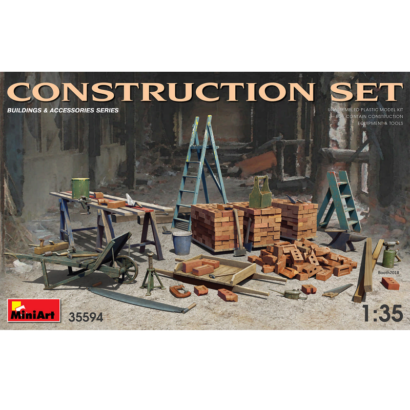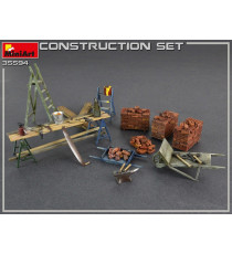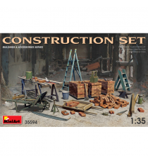 Cette boite maquette militaire Miniart au 1/35 propose les accessoires nécessaires pour construire un bâtiment (escabeau, briques, brouette...). Idéale pour d'agrémenter vos dioramas, réf : 35594