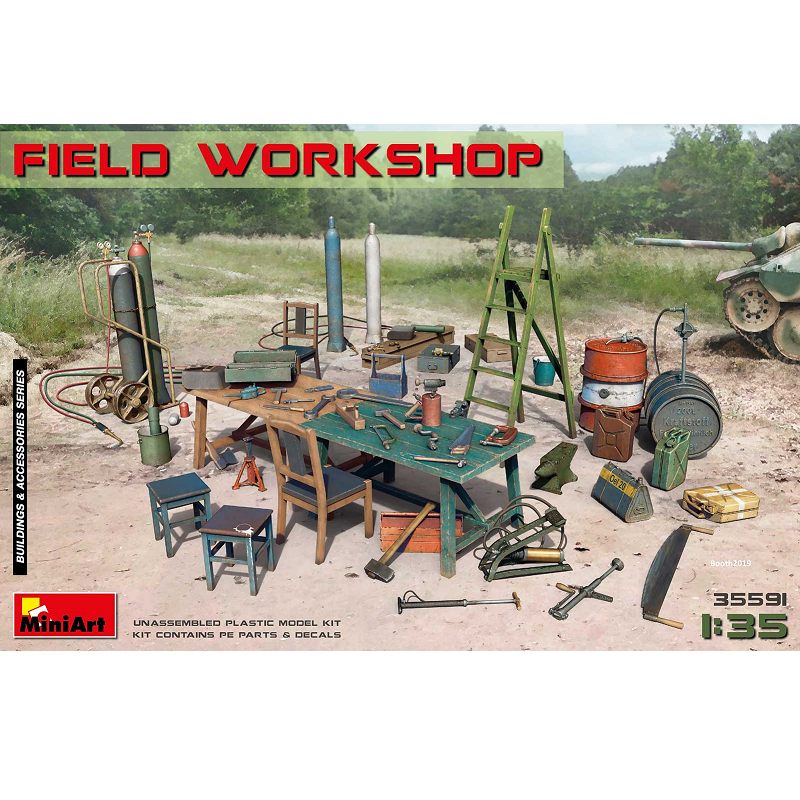 Cette boite maquette militaire Miniart au 1/35 propose les accessoires et outils pour représenter un atelier de campagne (bouteilles de gaz pour souder, outils divers, bidons d'huile,...). Idéale pour d'agrémenter vos dioramas, réf : 35591