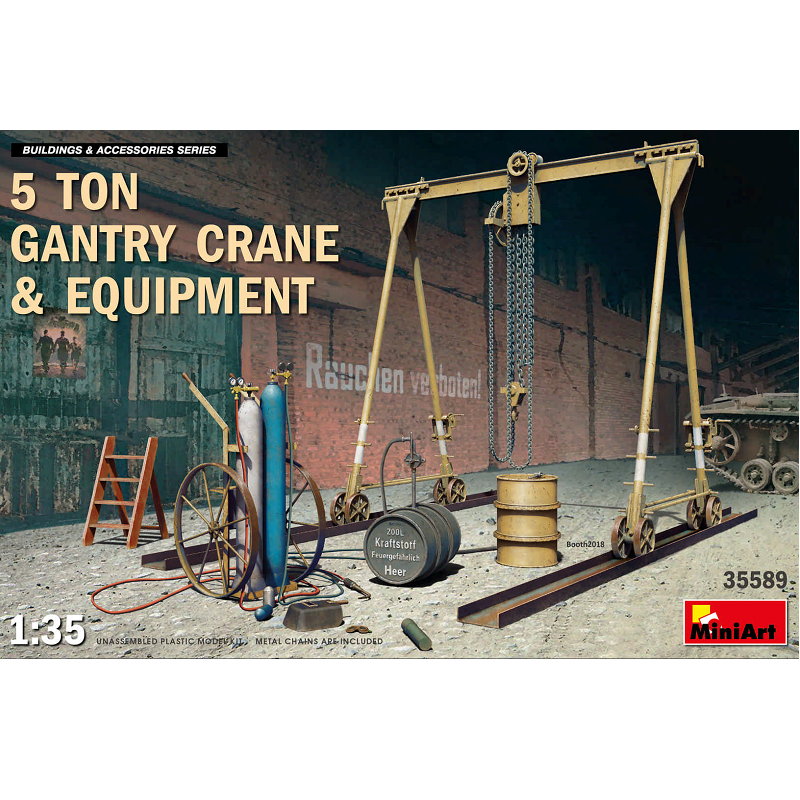 Cette boite maquette militaire Miniart au 1/35 propose un pont roulant accompagné d'accessoires (poste à souder, bidons d'huile?...). Idéale pour d'agrémenter vos dioramas, réf : 35589