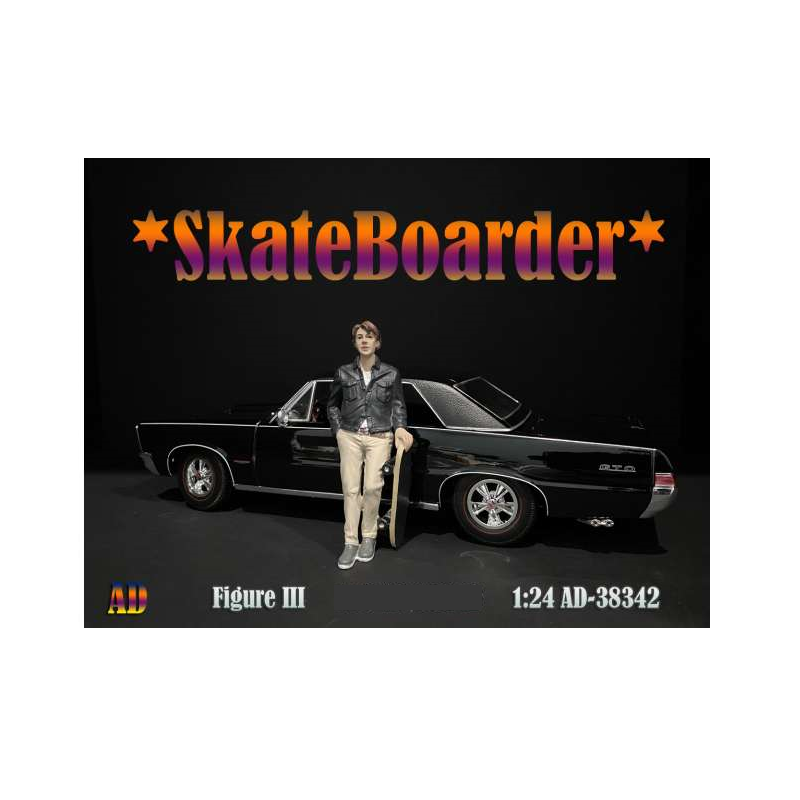 Cette maquette American Diorama propose une figurine déjà peinte représentant un homme avec son skateboard au 1/24 (la voiture n'est pas incluse dans le kit), réf : 38342