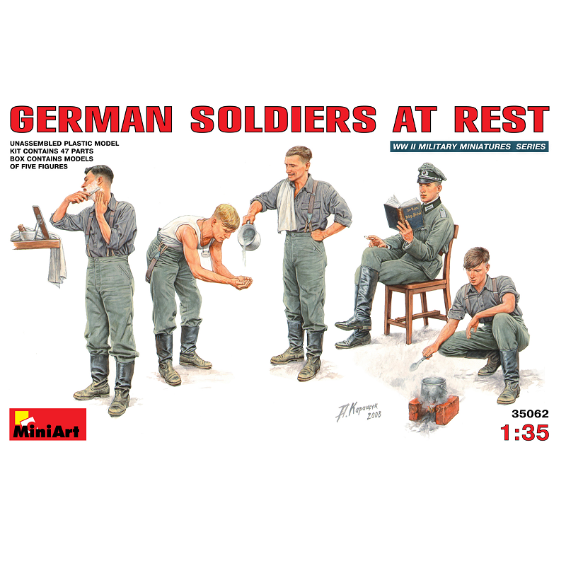 Cette boite maquette militaire Miniart au 1/35 propose cinq figurines de soldats allemands au repos au cours de la Seconde Guerre Mondiale. Elle contient également divers accessoires, réf : 35062