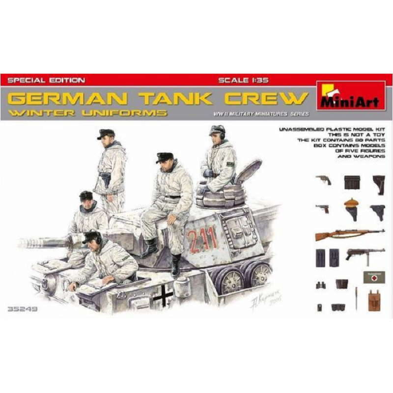 Cette boite maquette militaire Miniart au 1/35 propose cinq figurines de soldats allemands équipés pour l'hiver au cours de la Seconde Guerre Mondiale. Le kit contient également de nombreuses armes, réf : 35249