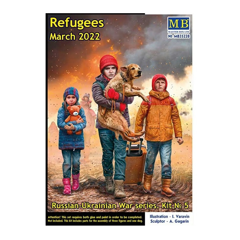 Cette boite maquette figurines MB au 1/35 propose trois figurines de réfugiés ukrainiens en mars 2002 avec un chien et leurs bagages, réf : 35228