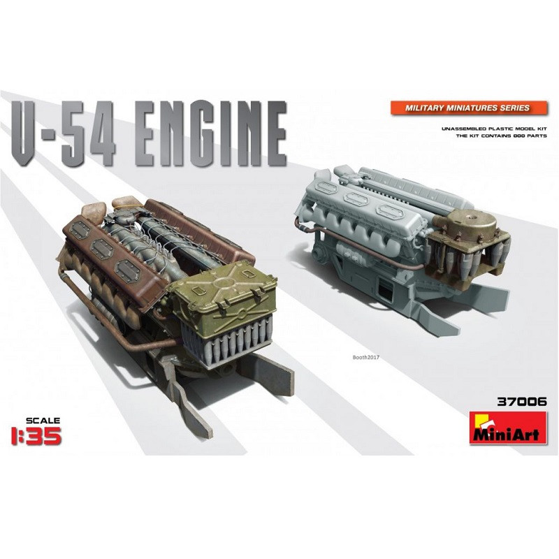 Cette boite maquette militaire Miniart au 1/35 propose un moteur V-54. Il s'agit d'un moteur sur base V-2 connu également sous le code « В-2 », moteur à explosion, quatre temps à allumage par compression, conçu et fabriqué par l'usine Malichev durant les années 30 pour équiper les futurs blindés de l'armée soviétique. Ce moteur de 520ch était monté sur les chars T-54, réf : 37006