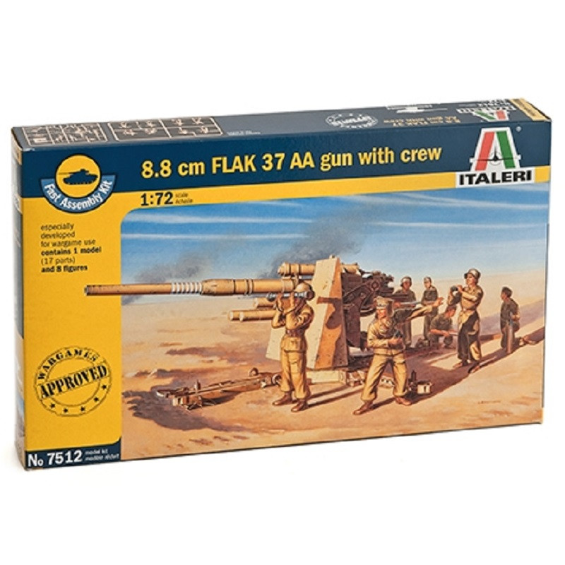Le canon de 88 mm désigne communément deux pièces d'artillerie allemande de la Seconde Guerre mondiale qui ont marqué les esprits, en particulier chez les tankistes. La maquette militaire Italeri au 1/72 propose une reproduction de ce modèle accompagnée de 8 figurines, réf: 7512