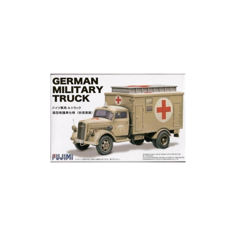 Cette maquette militaire Fujimi 1/72 propose une reproduction d'un camion allemand équipé en véhicule de secours pour le transport de blessé, réf: 72231