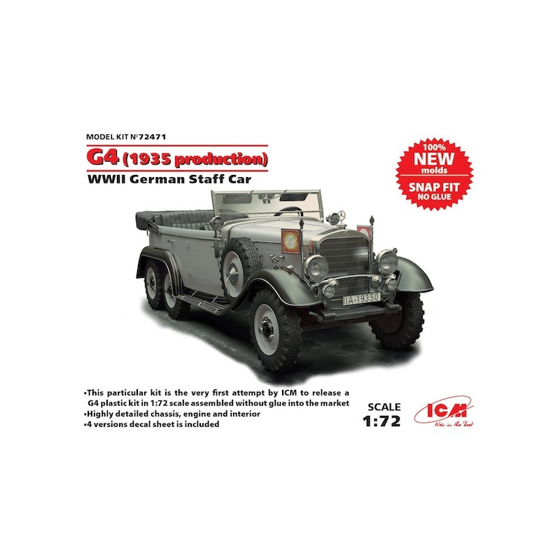 La G4 est une voiture trois essieux fabriquée par Daimler-Benz à partir de 1934. Elle était équipée d’un moteur 8 cylindres de 100 chevaux et pouvait accueillir 6 passagers. La maquette militaire ICM au 1/72 propose une version décapotée, réf: 72471