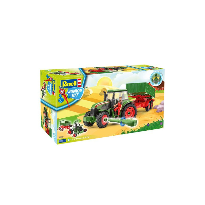 Cette maquette Revell représente un tracteur agricole accompagné de sa remorque. Il s'agit d'une maquette "Junior Kit" pour initier les débutants à partir de 4 ans. Elle est composée de grosses pièces robustes à assembler à l'aide de vis et d'un tournevis fournis et la boite contient une figurine, réf : 00817