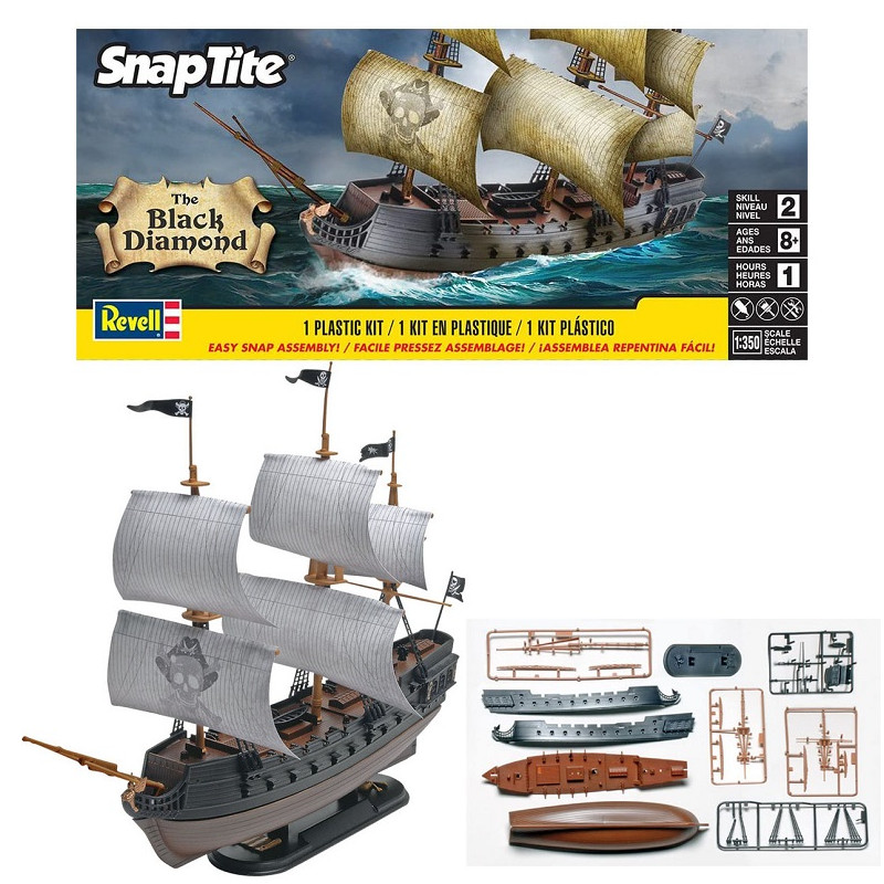 Cette maquette bateau Revell au 1/350 reproduit le bateau pirate "Black Diamond". Il s'agit d'une maquette Snap-Tite sans colle ni peinture pour initier les débutants, réf: 85-1971