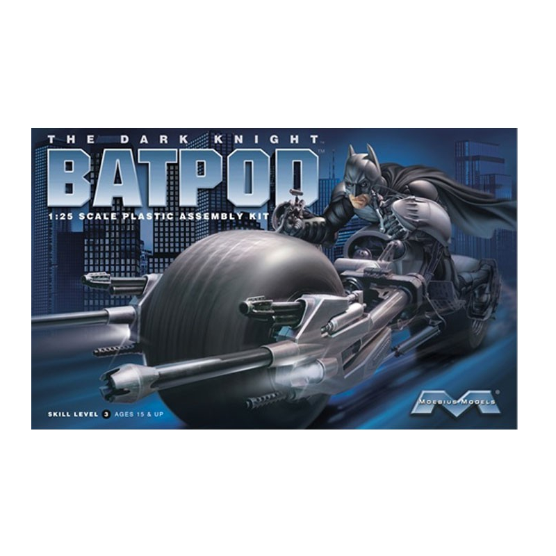 La BATPOD est la moto ultramoderne et sophistiquée du super-héros Batman introduite pour la première fois en 2008 dans The Dark Knignt. La maquette moto comics Moebius au 1/25 reproduit ce modèle, réf: 920