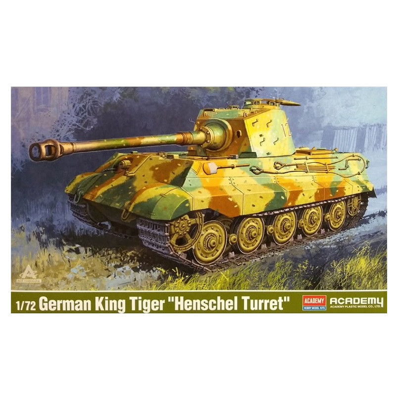 Le Panzerkampfwagen VI, surnommé Tiger, est un char lourd développé par l'Allemagne nazie, en service de 1942 à 1945 dans la Wehrmacht et la Waffen-SS. C'est l'un des chars les plus connus de la Seconde Guerre mondiale car, malgré ses nombreux défauts, il jouit très vite d'une réputation d'invincibilité, alimentée par une propagande nazie efficace. La maquette militaire Academy au 1/72 propose une reproduction de ce modèle en version tourelle Henschel, réf : 13423