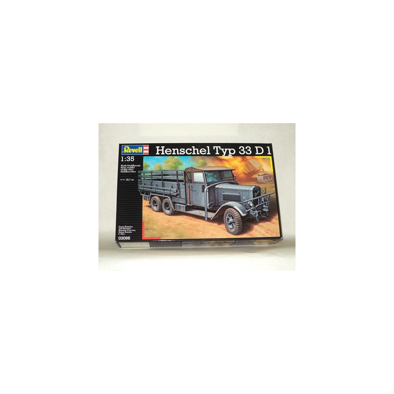 Le Henschel est un camion tout terrain à trois essieux avec une charge utile de trois tonnes. Le type 33 D 1, apparu en 1929, est propulsé par un moteur diesel de 100CV. La maquette Revell au 1/35 reproduit la version tardive, produite après 1934, utilisant un seul arbre de transmission, réf: 03098