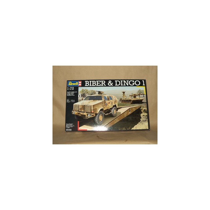 Le Biber est un char poseur de pont mis en service dans l'armée allemande en 1973. Le Dingo est un véhicule blindé tout terrain notamment utilisé lors d'opérations extérieures. La maquette militaire Revell au 1/72 contient ces 2 véhicules ainsi que les éléments du pont mobile, réf: 03192