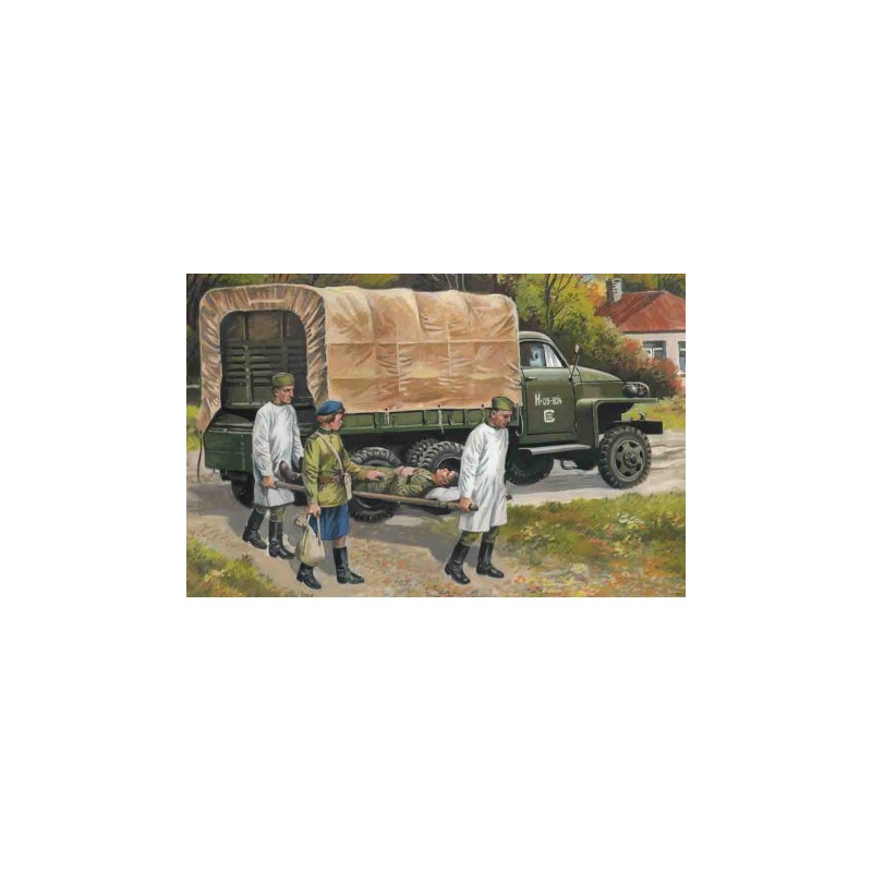 Le camion de transport US6 a été mis au point par la société Studebaker pour le compte de l'armée américaine au début de la Seconde Guerre Mondiale. La maquette militaire ICM au 1/35 reproduit une version bâchée pouvant servir de transport de blessés et est accompagnée de quatre figurines, réf: 35513
