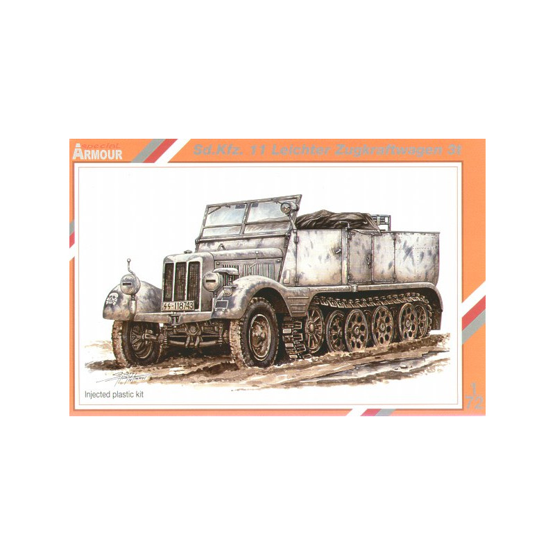 Le Sd Kfz 11 est un engin semi-chenillé conçu comme tracteur d'artillerie et produit à approximativement 9 000 exemplaires au cours de la Seconde Guerre mondiale. La maquette militaire Special Armour au 1/72 propose une reproduction de ce modèle, réf: 72002