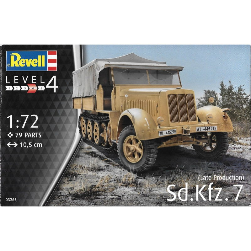Le Sd.Kfz. 7 est une autochenille (halftrack en anglais) à usage militaire utilisée au cours de la Seconde Guerre mondiale par la Wehrmacht. La maquette militaire Revell au 1/72 propose la version ultime de ce modèle, réf : 03263