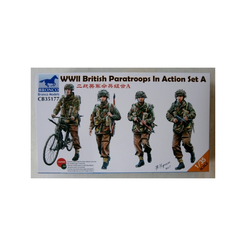 Cette maquette militaire Bronco au 1/35 propose quatre figurines de parachutistes britanniques et un vélo. La boite contient des éléments en photodécoupe, réf : 35177