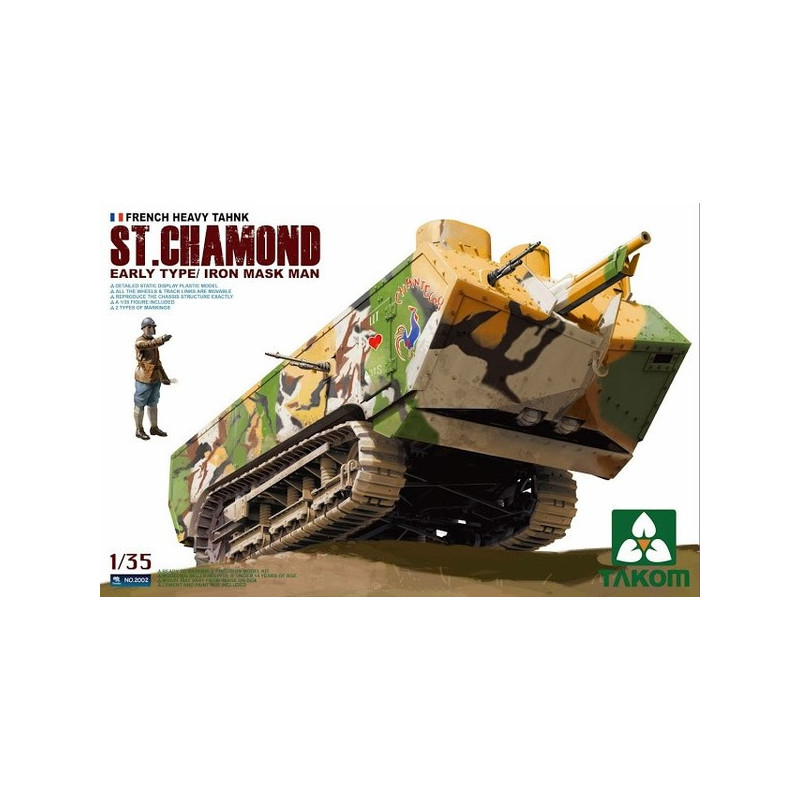 Le Saint-Chamond est le deuxième char d'assaut produit pour l’Armée Française au cours de la Première Guerre mondiale. La maquette militaire Takom au 1/35 propose une reproduction du modèle dans sa version initiale, elle est accompagnée d'une figurine, réf: 2002