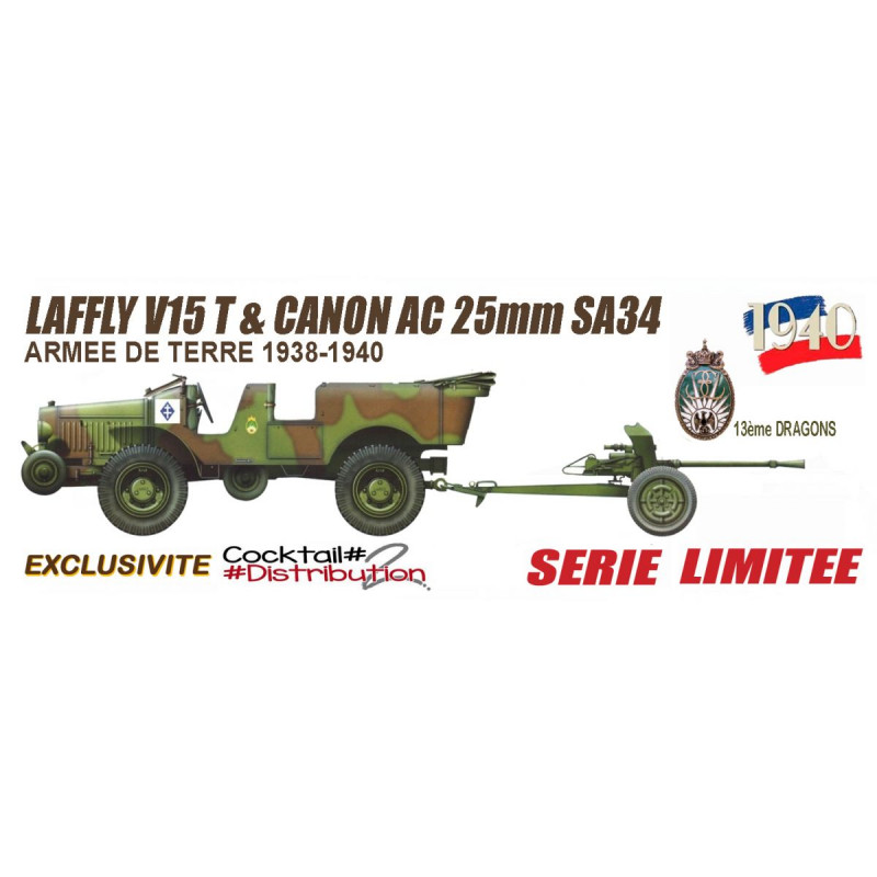 Le tracteur léger V15T est développé par Laffly courant 1938 en réponse au besoin de la Cavalerie pour équiper les escadrons divisionnaires anti-chars (EDAC) et destiné exclusivement à la traction du canon de 25mm SA 34. Le compartiment arrière comporte une série de cinq coffres pour les munitions et paquetages. La maquette militaire ICM au 1/35 se compose du Laffly V15 T dans sa version d'origine telle que destinée à l'Armée de terre avec équipage de 5 hommes et attelage spécifique pour tracter la pièce de 25mm antichar. Le canon de 25 mm SA propose également un lot de pièces en résine pour enrichir le détail du modèle: roues avec sculpture de bande de roulement des pneumatiques, culasse, volants de pointage, etc.... Une décoration spécifique est également incluse pour un véhicule du 12ème Dragons rattaché à la 2ème DLM en Mai-Juin 1940, réf: 35570F