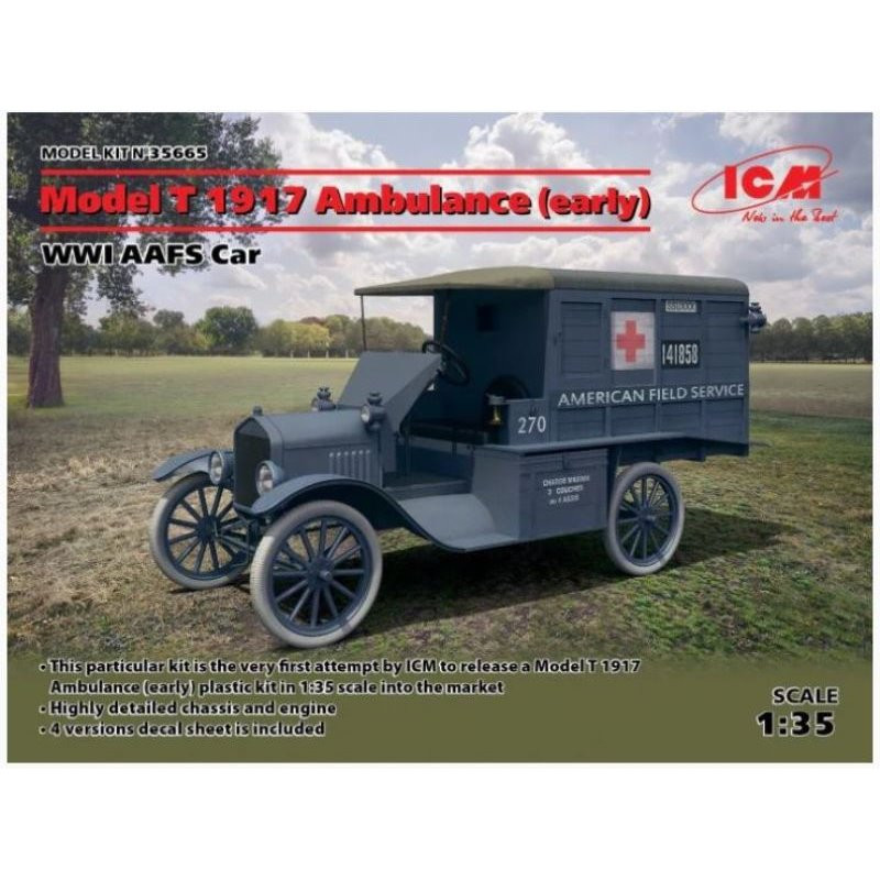 La Ford T est une automobile fabriquée de 1908 à 1927 par la Ford Motor Company sous la direction de Henry Ford. Elle est généralement considérée comme la première voiture accessible au plus grand nombre, celle qui « mit l'Amérique sur des roues ». La maquette voiture ICM au 1/35 reproduit un modèle de 1917 ayant servi d'ambulance au cours de la première guerre, réf: 35665