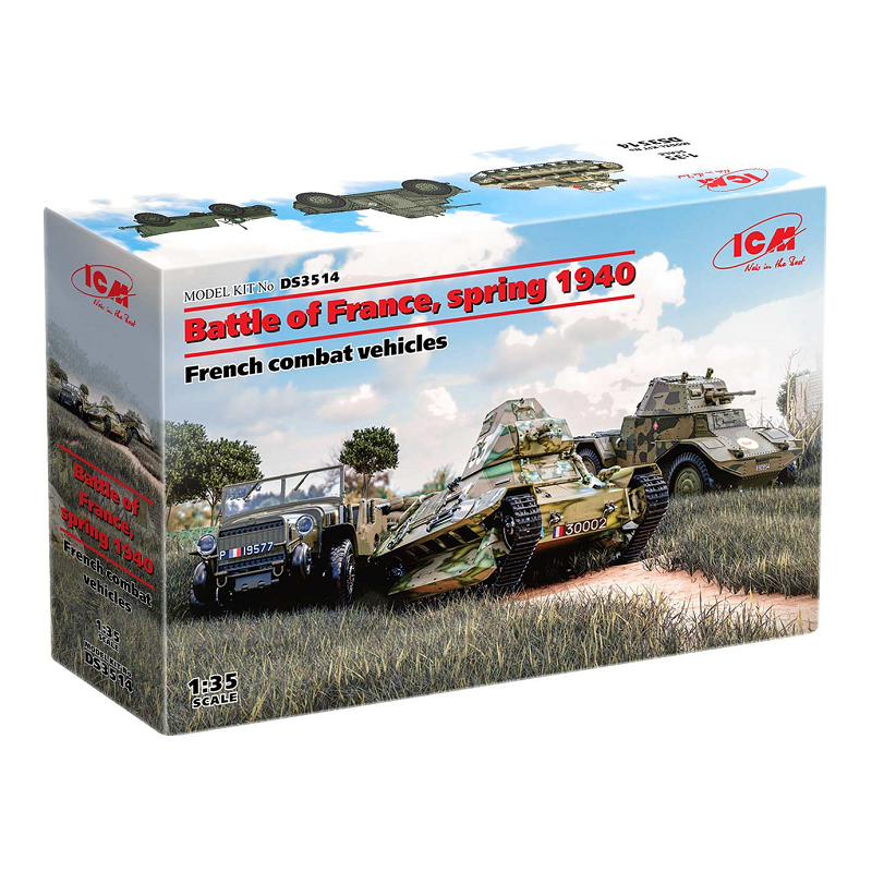Cette maquette militaire ICM au 1/35 propose trois véhicules français permettant de reproduire une bataille au printemps 1940 : Panhard 178 AMD-35, FCM-36 et Laffly V15T, réf: DS3514