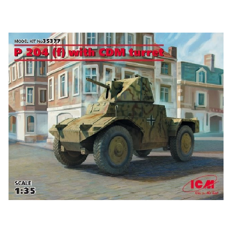 Suite à l’effondrement de l’armée française en juin 1940, Les Allemands récupèrent quelques 190 AMD Panhard 178. Cette excellente automitrailleuse de découverte est intégrée dans les effectifs de la Wehrmacht sans autre modification que l’attribution d’une livrée gris-panzer et de croix balkaniques blanches. La maquette militaire ICM au 1/35 propose une version avec une tourelle "CDM", réf: 35377