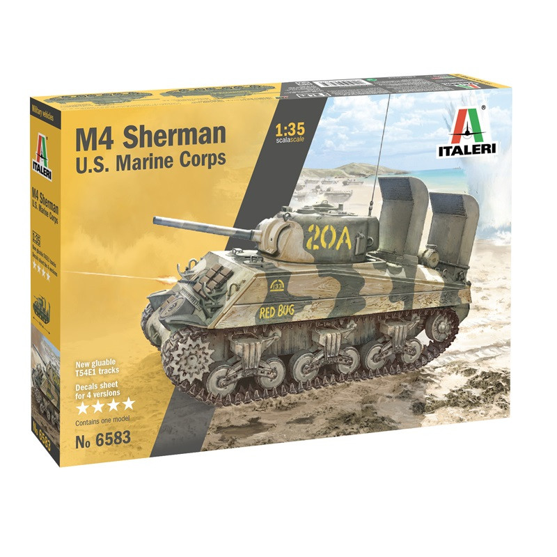 Le char moyen américain M4 Sherman est l'un des plus célèbres chars de l'histoire. C'est le char le plus utilisé par les Alliés occidentaux pendant la Deuxième Guerre mondiale. Il a bâti sa réputation sur ses nombreuses qualités inhérentes, ainsi que sur le grand nombre d'unités produites. La maquette militaire Italeri au 1/35 propose ce modèle aux couleurs des Marines américains, réf : 6583