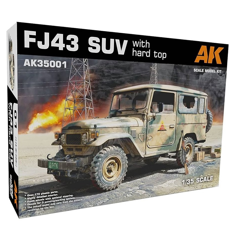 Le Toyota FJ43 est un modèle de 4x4 produit par la célèbre société nippone depuis 1953. Ce véhicule est particulièrement robuste, économique et fiable. Il a été utilisé pendant des décennies pour des tâches militaires et civiles, et reste toujours en service dans de nombreux pays. La maquette militaire AK Interactive au 1/35 propose la version HardTop, probablement l'une des variantes les plus populaires utilisées, réf: 35001