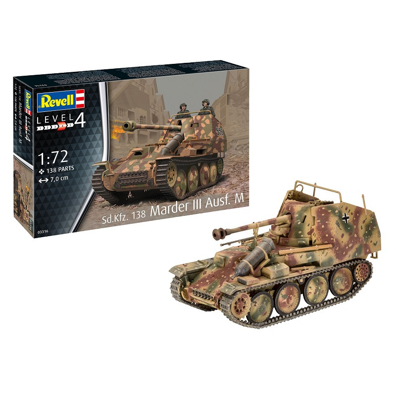Le Marder III est un chasseur de chars allemand de la Seconde Guerre mondiale construit sur le châssis du Panzer 38. Il fut en production de 1942 à 1944 et servit sur tous les fronts jusqu’à la fin de la guerre. La maquette militaire Revell au 1/72 propose une reproduction de ce véhicule, réf: 03316