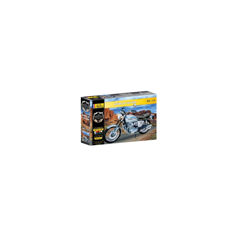 4 cylindres, 4 temps, 4 carburateurs, 4 échappements séparés: présentée au salon de Tokyo en novembre 1968, puis en France en mars 1969, la HONDA CB 750 Four, premier 4 cylindres de tourisme, fait l'effet d'une bombe. La maquette moto Heller au 1/8 reproduit le modèle K2 distribué en France à partir de janvier 1972. Elle se compose de 286 pièces, la boite contient colle, peintures et pinceau, réf: 52913