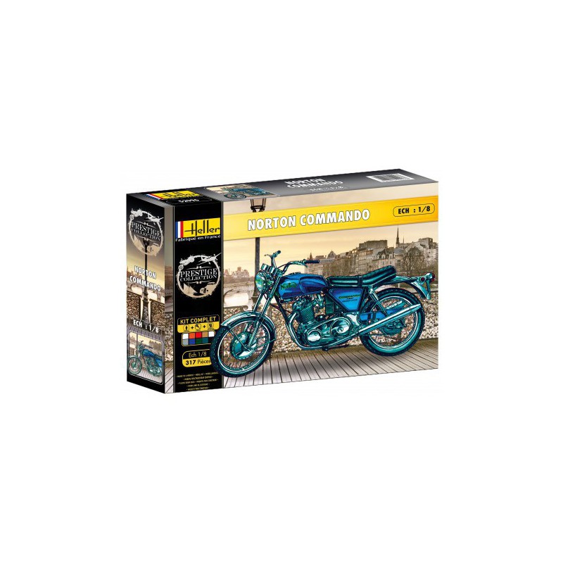 La Norton 750 Commando a été produite de 1968 à 1977 et a remporté à cinq reprises le titre de « moto de lannée ». Elle était dotée dun moteur bicylindre parallèle. La maquette moto Heller au 1/8 se compose de 317 pièces, la boite contient colle, peintures et pinceau, réf : 52996