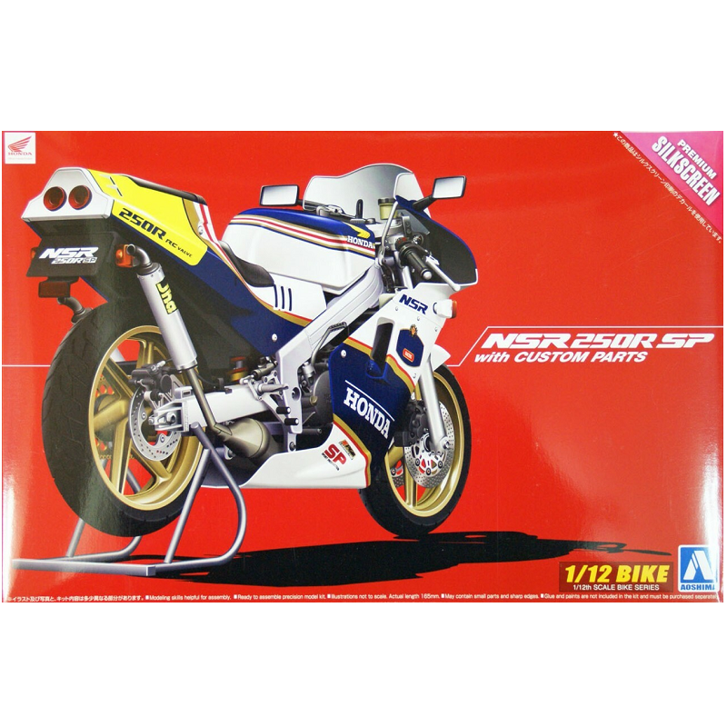 La Honda NSR250R est une moto sportive deux temps de 249 cc produite par Honda entre 1987 et 1999. La maquette moto Aoshima au 1/12 reproduit ce modèle, réf: 05439