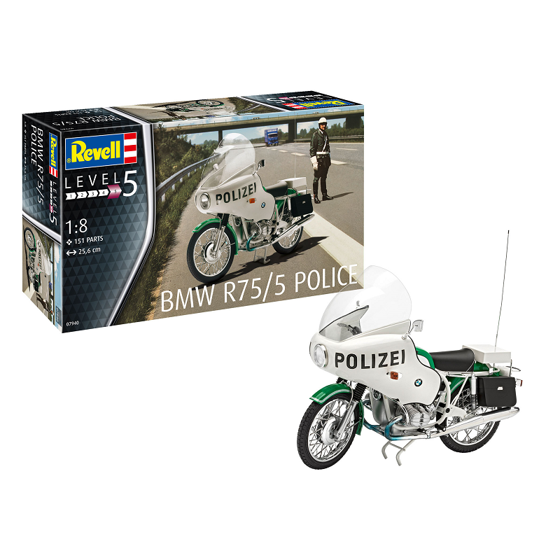 La BMW R 75/5, produite de 1969 à 1973, est équipée d'un moteur flat-twin. La maquette Revell au 1/8 propose ce modèle aux couleurs de la Polie avec diverses pièces chromées, des roues mobiles et un moteur détaillé, réf : 07940
