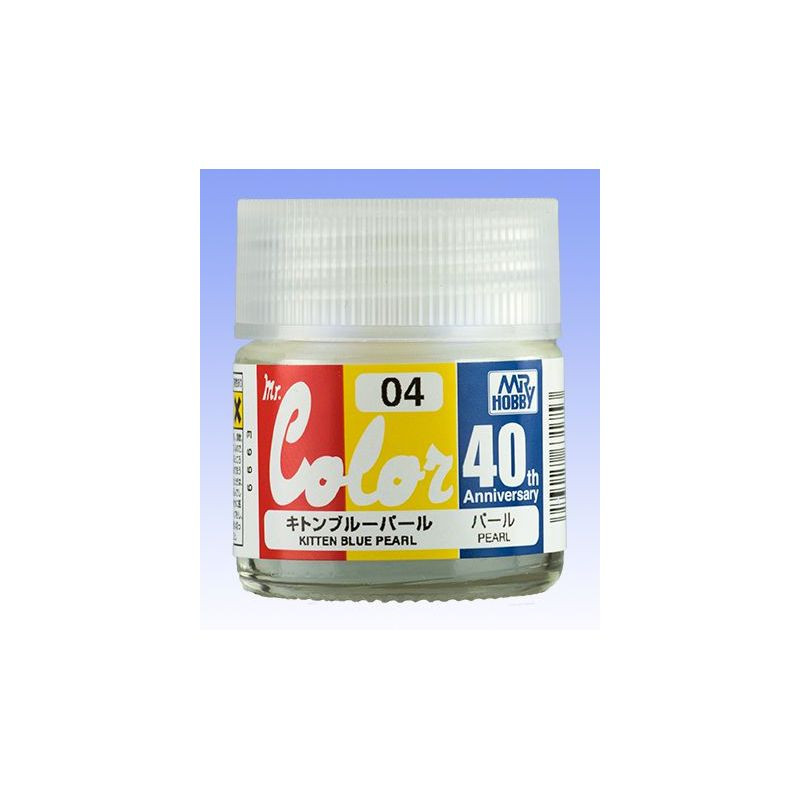 Pour le 40ème anniversaire de la marque, Mr Color a choisi de sortir une gamme de peinture enamel avec des coloris spéciaux. Pot de peinture enamel kitten blue pearl nacré, 10ml. A diluer avec du "Mr Color Thinner" (réf : T101, T102 ou T103), réf: AVC04