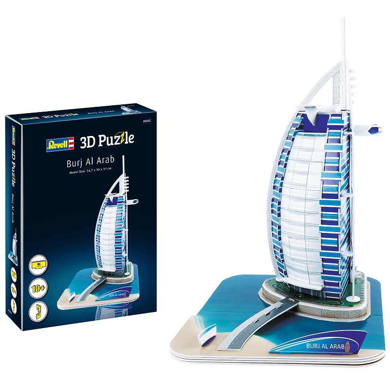 Le Burj al Arab, considéré comme l'un des meilleurs hôtels du monde, est situé sur sa propre île à environ 300 mètres de Dubaï. Construit en forme de voile de bateau, ce monument au design moderne de 321 mètres de haut abrite un total de 202 suites. Du plaisir pour petits et grands ! Avec les puzzles Revell 3D, vous pouvez construire des bâtiments célèbres dans le monde entier, des horizons impressionnants ou des véhicules légendaires. Les composants en mousse découpés avec précision facilitent le montage - pas besoin de colle ou d'outils. Selon la taille et la complexité du modèle, le plaisir de construire peut varier de quelques minutes à plusieurs heures. Ce monument se compose de 46 pièces et mesure 247 x 200 x 310 mm une fois monté, réf : 00202