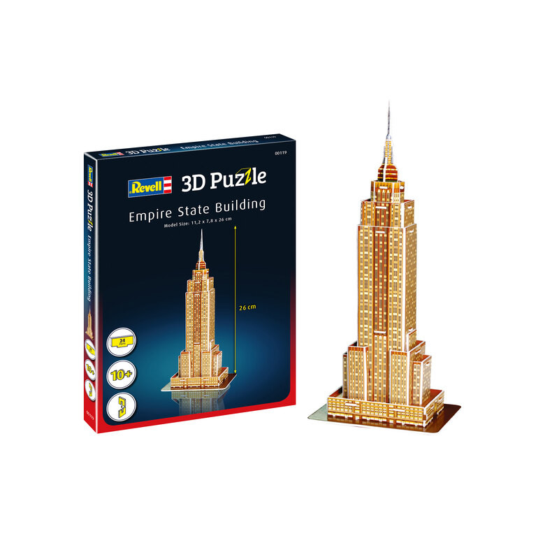 L’Empire State Building est un gratte-ciel de style Art déco situé dans l'arrondissement de Manhattan, à New York. Il est situé dans le quartier de Midtown au 350 de la 5ᵉ Avenue, entre les 33ᵉ et 34ᵉ rues. Inauguré le 1ᵉʳ mai 1931, il mesure 381 mètres et compte 102 étages. Du plaisir pour petits et grands ! Avec les puzzles Revell 3D, vous pouvez construire des bâtiments célèbres dans le monde entier, des horizons impressionnants ou des véhicules légendaires. Les composants en mousse découpés avec précision facilitent le montage - pas besoin de colle ou d'outils. Selon la taille et la complexité du modèle, le plaisir de construire peut varier de quelques minutes à plusieurs heures. Ce monument se compose de 24 pièces et mesure 112 x 78 x 260 mm une fois monté, réf : 00119