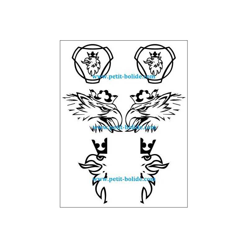 Planche dautocollants représentant divers logos Scania noirs permettant de décorer vos maquettes camion 1/24 ou 1/25, épaisseur 70 microns