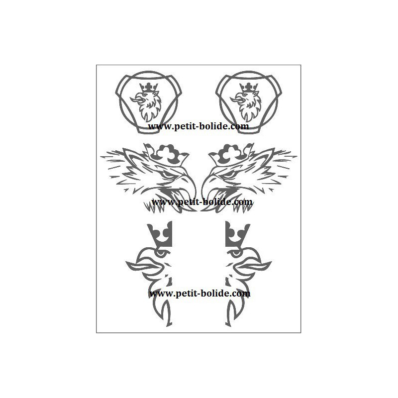 Planche dautocollants représentant divers logos Scania gris métallisé permettant de décorer vos maquettes camion 1/24 ou 1/25, épaisseur 70 microns