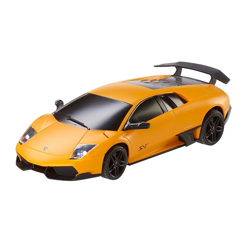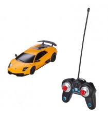 Cette Lamborghini au 1/24 peut rouler jusqu'à 10 km/h et est équipée de phares et feux stop à leds. Ce modèle télécommandé d'une fréquence de 40 Mhz fonctionne avec 3 piles AA (LR06) non fournies et une batterie fournie qui se charge en quelques minutes. Elle mesure 190 x 50 x 90 mm. À partir de 8 ans, réf : 24650