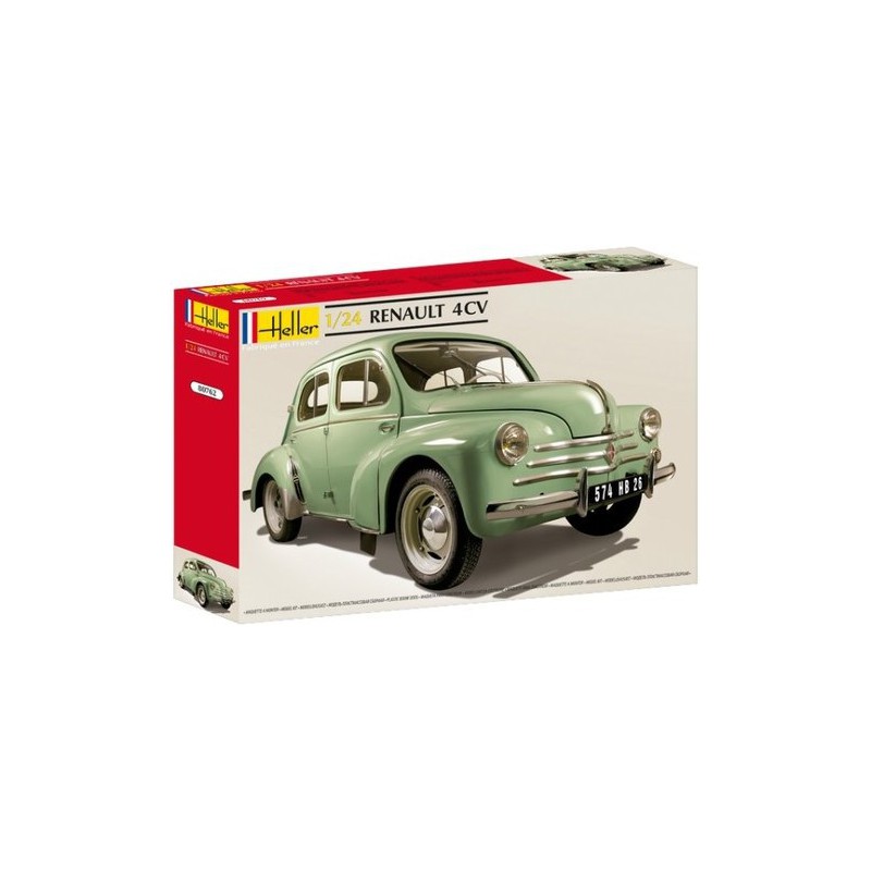 La Renault 4CV est une petite voiture, mais elle est particulièrement spacieuse pour son époque. Surnommée la « 4 pattes » mais aussi « la motte de beurre » à cause de sa forme et de la couleur jaune de ses premiers exemplaires, elle symbolise le retour de la paix et de la prospérité car elle est la première voiture française accessible au plus grand nombre comme l'indique le slogan publicitaire diffusé à l'époque : « 4 chevaux, 4 portes, 444 000 francs ! ». Voiture la plus vendue en France jusqu'en 1955, c'est la première française à atteindre une production d'un million d'exemplaires. La maquette voiture Heller au 1/24 permet de reproduire ce modèle mythique d'après-guerre, réf: 80762