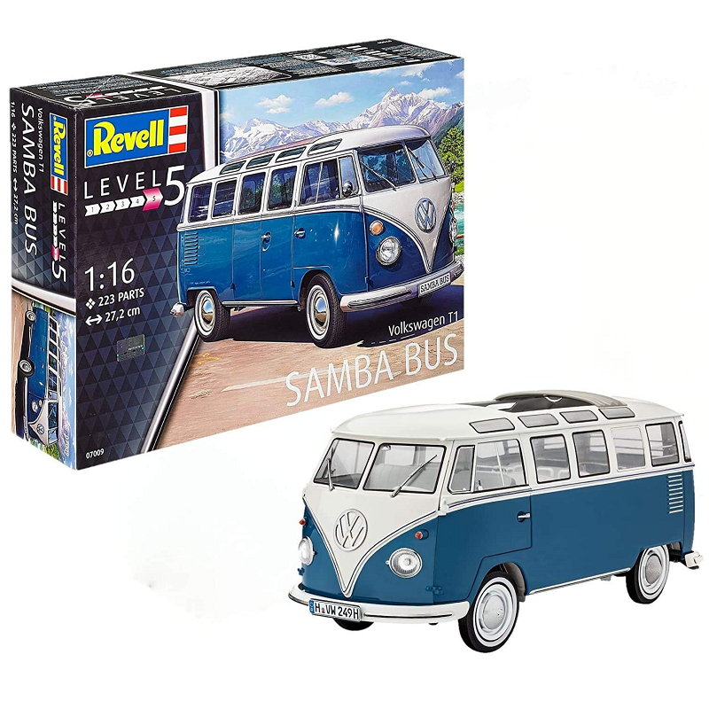 VW a réalisé à la fin des années 40 plusieurs prototypes de véhicules ayant un gros volume intérieur, destinés au transport. La nouvelle gamme de véhicules fût appelée "transporter". Le 8 mars 1950, la production en série de la première génération de Transporters était lancée. Ce véhicule à lavant typique en V, avec un pare-brise en deux parties, était disponible en divers modèles, parmi lesquels un minibus. Le modèle de luxe, un modèle spécial à 9 places, est encore appelé aujourdhui "Samba Bus". Grâce aux portières ouvrantes, la maquette réalisée par Revell au 1/16ème permet de très bien voir laménagement intérieur. Pour remémorer limmense succès connu aux USA, la boite permet de construire la version européenne ou la version américaine. réf : 07009