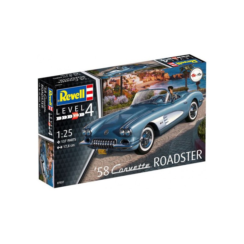 La Corvette C1 est un petit roadster deux places en fibre de verre équipé notamment d'un V8 Small Block et produite de 1953 à 1962. La maquette voiture Revell au 1/25 propose le modèle '58 et de nombreuses pièces chromées, réf: 07037. Les références des peintures Revell recommandées pour ce modèle sont : 01, 07, 09, 52, 55, 56, 75, 99, 302 et 378 Niveau de difficulté = 4 137 pièces Dimension : 17,8cm