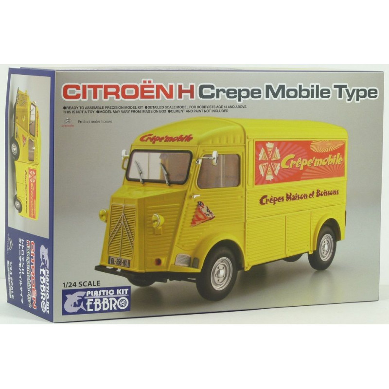 Le Citroën Type H fait partie des quelques rares véhicules utilitaires qui brillent en collection. Il faut dire que le fourgon au double chevron a rendu bien des services dans les campagnes durant des décennies, effectuant toujours ses tâches besogneuses avec une certaine bonhomie. Présenté en 1947, il a été lancé en 1948. La maquette voiture Ebbro au 1/24 reproduit une version crêperie ambulante, réf : 25010