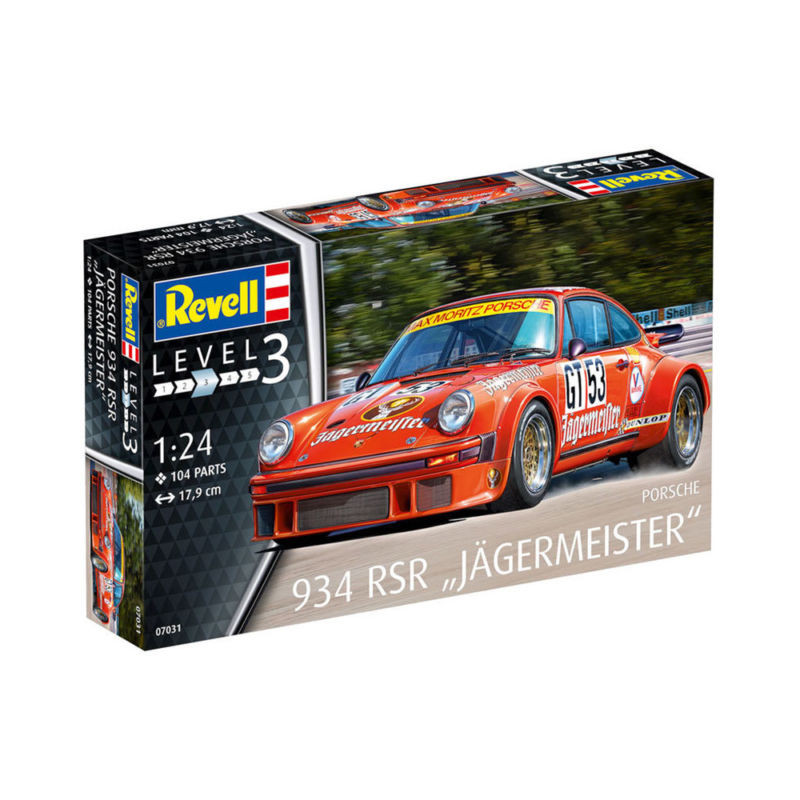 La Porsche 934, apparue en 1976, était la version Groupe 4 (GT de série) de la Porsche 911. La maquette voiture Revell au 1/24 propose une version RSR aux couleurs "Jägermeister", réf: 07031