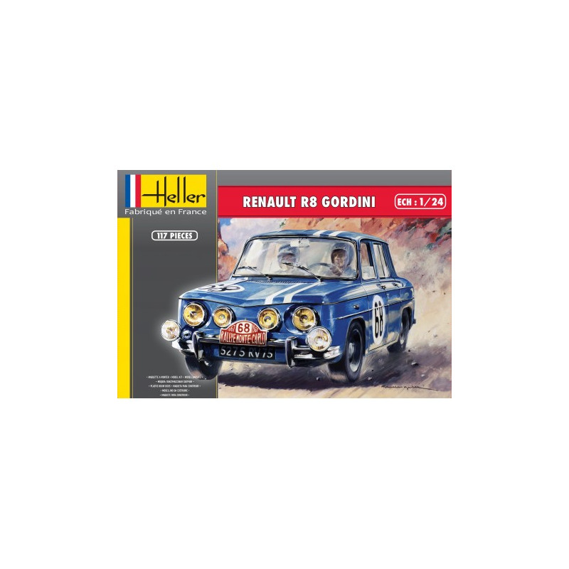 La Régie Renault lance en 1962 la Renault 8 qui sera, avec la R10, la dernière voiture avec un moteur placé à l’arrière jusqu’à l’apparition de la Twingo III en 2014. Il faudra attendre le salon de Paris 1964 pour découvrir le modèle R8 Gordini (TYPE R1134). Elle sera très vite reconnaissable dans sa robe Bleu France 418 et sa double bande blanche courant sur toute la longueur de la voiture. La maquette voiture Heller au 1/24 reproduisant ce modèle mythique se compose de 117 pièces, réf: 80700