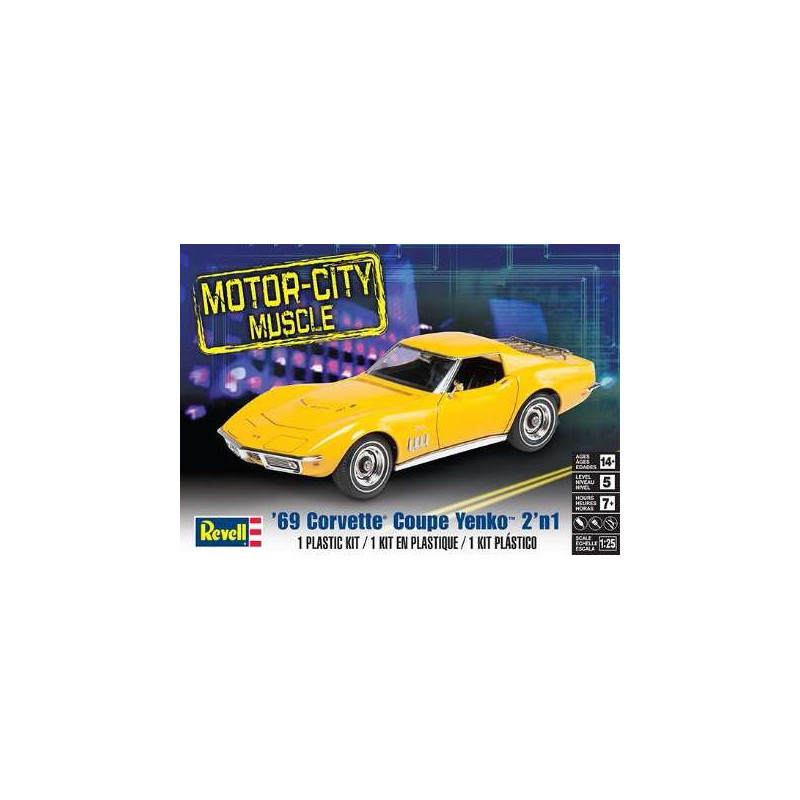 Cette maquette voiture Revell au 1/25 propose une reproduction de Corvette coupé 1969 préparé par le célèbre équipementier US Yenko en Pennsylvanie. Il s'agit d'un modèle 2n1 proposant plusieurs finitions au choix, réf: 85-4411