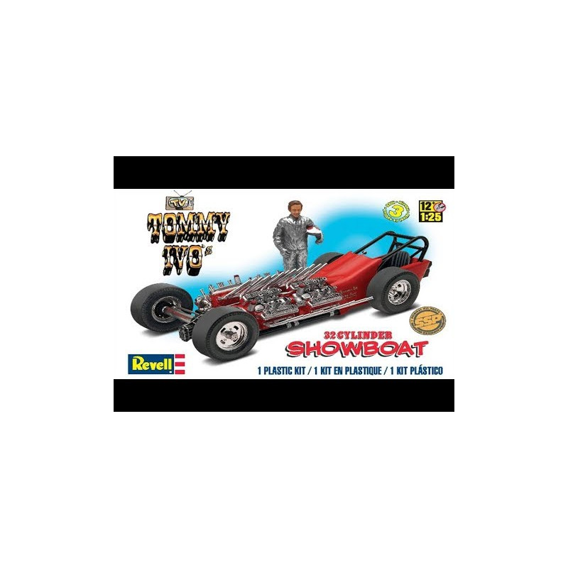 Tommy Ivo est un acteur et pilote de dragsters actif dans la communauté des courses des années 1960. La maquette voiture Revell au 1/25 propose une reproduction de son modèle "Showboat", elle est accompagnée d'une figurine, réf: 85-1285