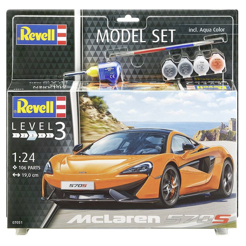 La McLaren 570S est une Supercar de la catégorie Sports Séries qui est produite par McLaren pour 2015. Elle est appelée ainsi en référence à son moteur de 570 chevaux. La maquette voiture Revell au 1/24 propose une reproduction fidèle de ce modèle d'exception. Il s'agit d'un Model set contenant la colle, un pinceau et les peintures nécessaires à la réalisation de ce modèle, réf: 67051