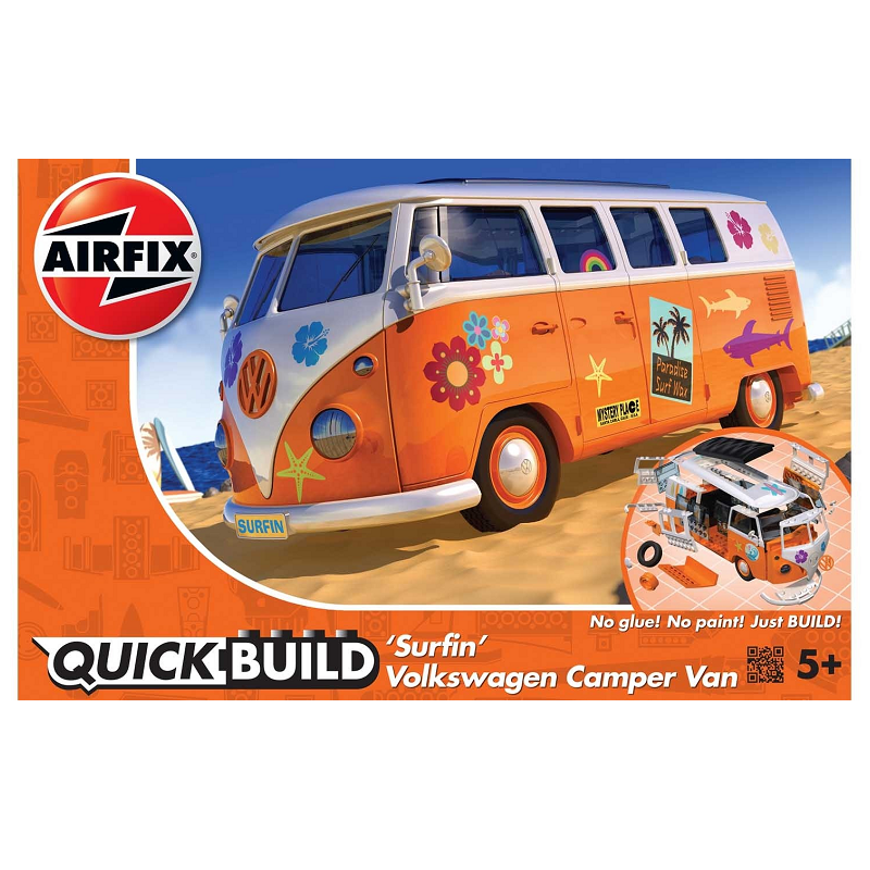 Cette maquette voiture Airfix représente un Volkswagen Combi orange "Surfin". Il s'agit d'une maquette Quick Build sans colle ni peinture pour initier les débutants à partir de 5 ans, réf : J6032