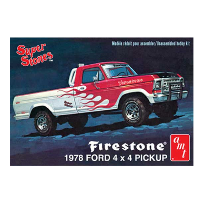 Le Ford F-Series est une gamme américaine de modèles de pick-up de la société Ford Motor Company, vendue pendant plus de cinq décennies. La maquette voiture AMT au 1/25 reproduit le modèle de 1978 aux couleurs "Firestone", réf: 858